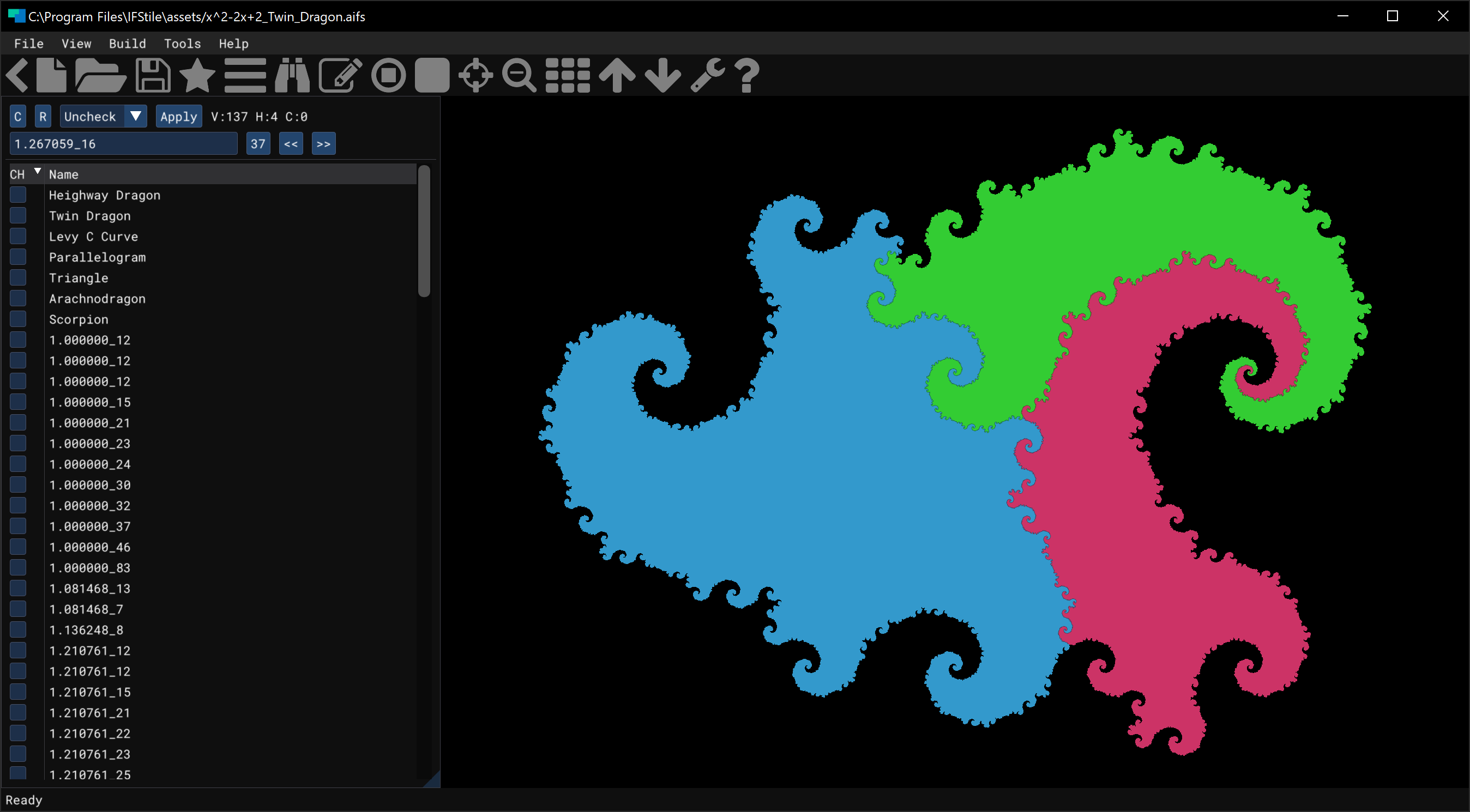 - Multidimensional IFS Construction: Build affine directed graph Iterated Function Systems in arbitrary Euclidean dimensions, with full support for 2D and 3D cross-sections.
