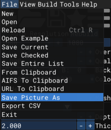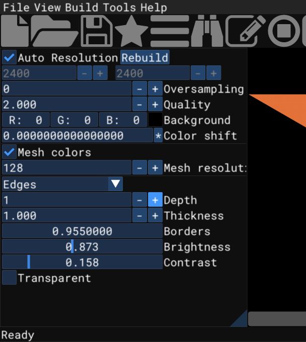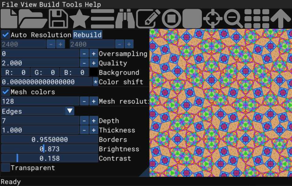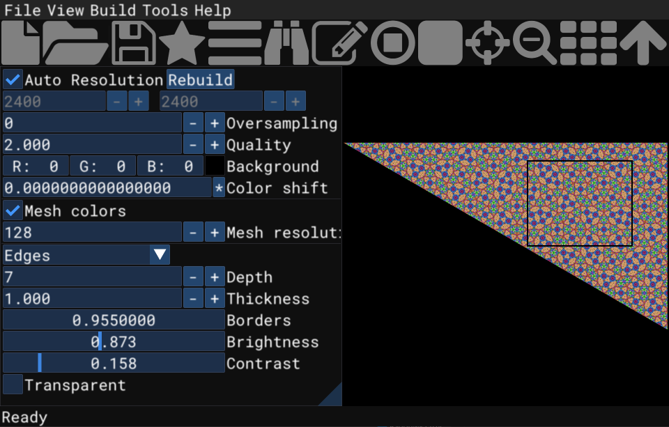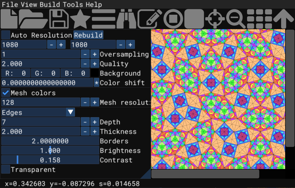 Set Resolution to 1080x1080, uncheck “Use window resolution”, set Thickness=2, Borders=2, Oversampling=2 and click “Rebuild” button: